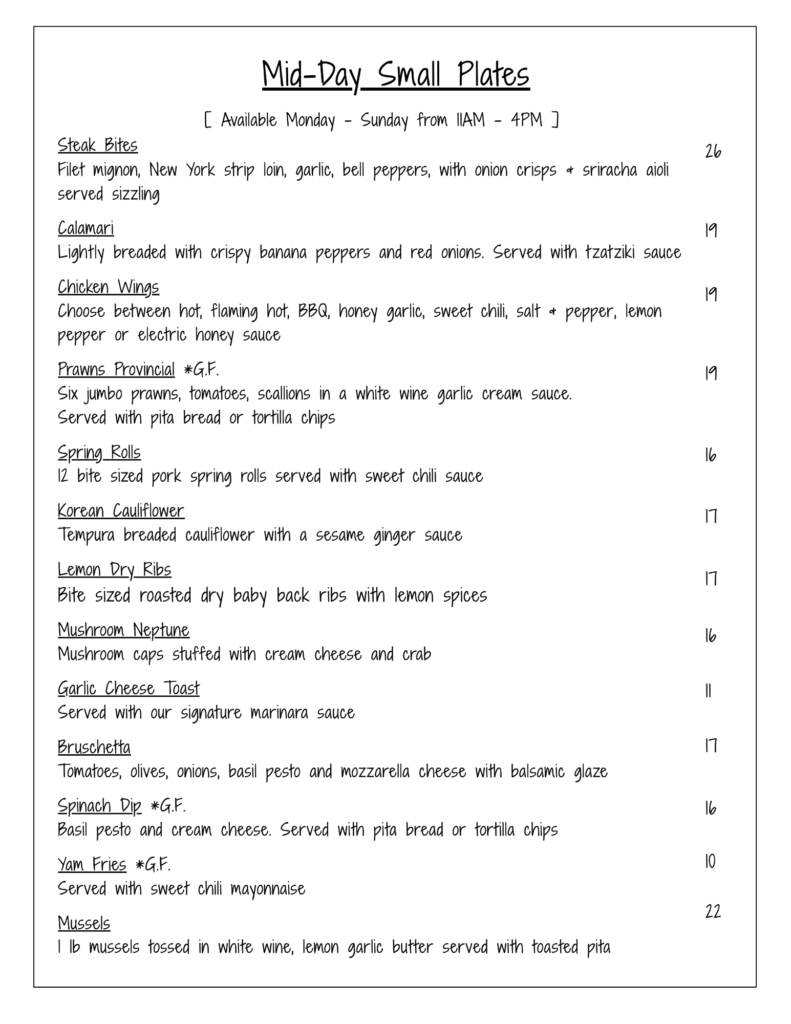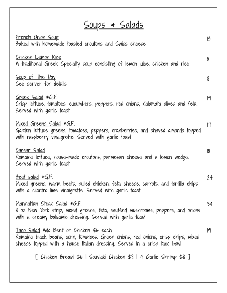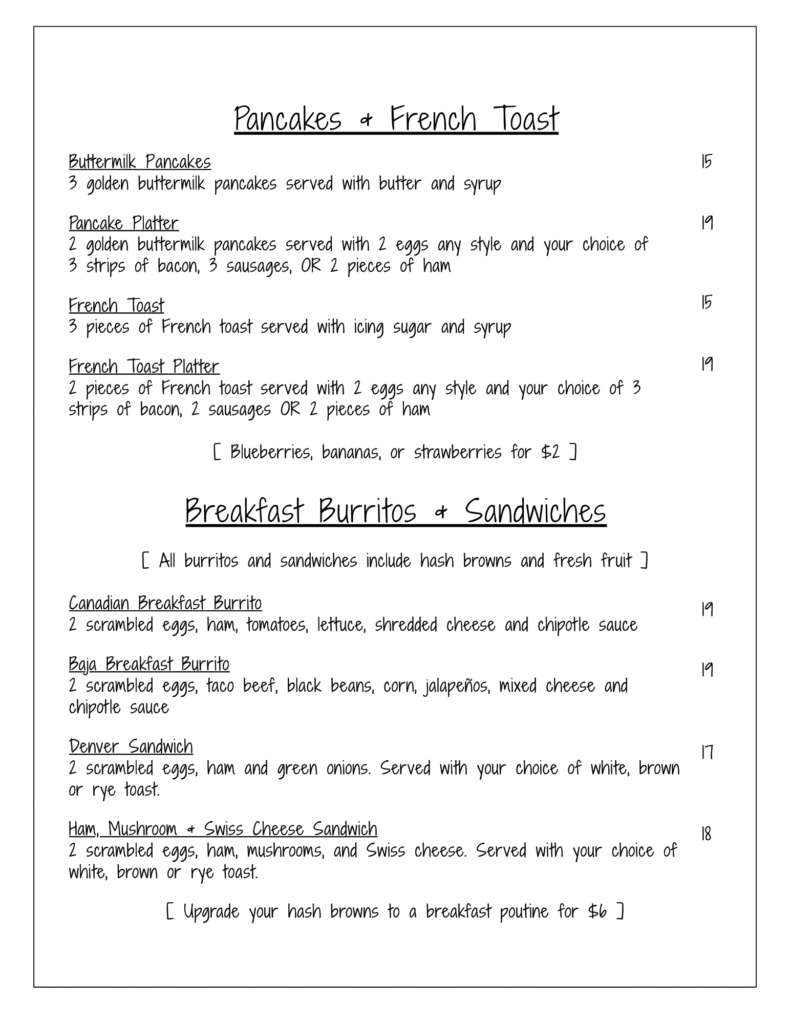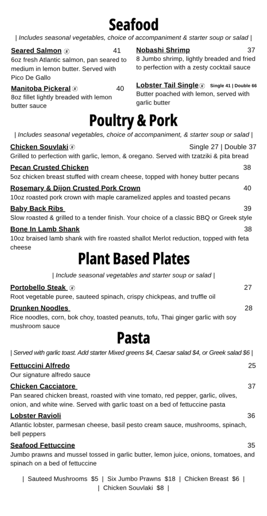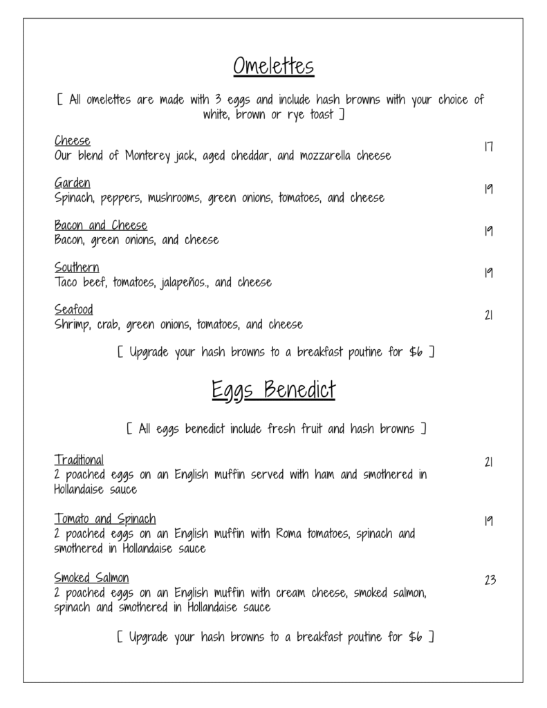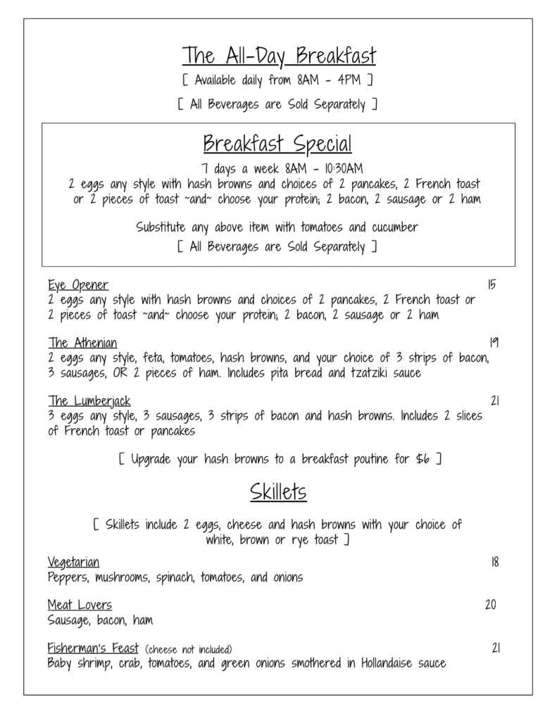 Our Menu unforgetable flavors Great Selections from our chef Breakfast & Lunch BREAKFAST SPECIALMonday to Friday 8am to 10:30am – $10(Includes bottomless coffee) Lunch Specials Monday to Friday 11:00am to 2:00pm Dinner Menu Unforgettable flavors Liquor Menu Gallery memories Home About Menus Reservations Contact Facebook Instagram Home About Menus Reservations Contact Facebook Instagram